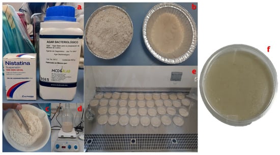 Procedure for the production of the ISP-3 oatmeal agar culture medium. (a). Base materials for the elaboration of specific medium. (b). Weighing oats and nystatin. (c). Mixture of all components, (d). Stirring on magnetic plate stirrer. (e). Pouring oatmeal agar into a Petri dish. (f). Gelled oatmeal agar with ISP-3 culture medium.