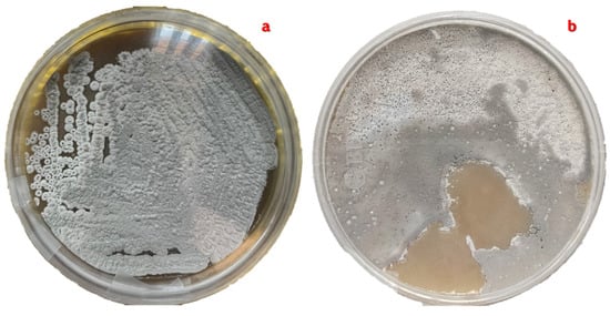 Pure cultivation of S. avermitilis with cotton-like aerial mycelium in gray tones. (a). Pure culture product of the cross-striation technique with four quadrants. (b). Pure culture obtained with the rod dragging technique.