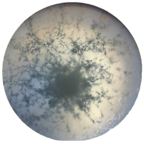 Sporulation of S. avermitilis bacteria occurred in the culture medium of ISP-3 oatmeal agar supplemented with 1% nystatin. On the seventh day of incubation in complete darkness at a temperature of 30 °C, the pure culture reached its peak maturity, as 95% of the plate cultures had cotton-like aerial mycelium in shades of gray and white (Figure 3, Figure 4 and Figure 5).