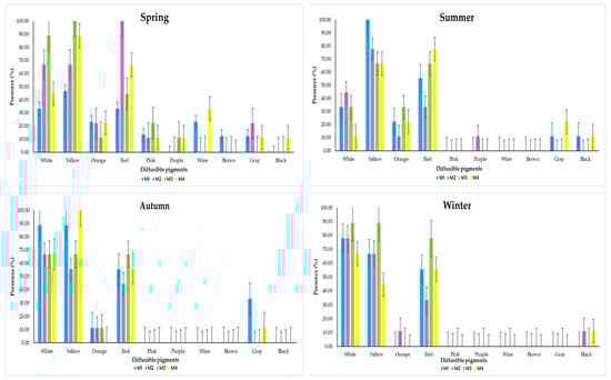 Each variable was analyzed with the SAS program, version 9.4 (SAS Institute, Inc., Cary, NC 27513, USA), using a completely randomized block design (four blocks—seasons of the year—with four treatments—M1, M2, M3 and M4—and three replications).
