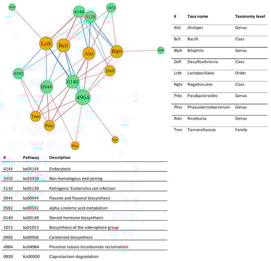 3.5. Covariance Network Analysis Shows That the Genus Alistipes and Bilophia Are the Most Significant Features, Correlated to the Most Metabolic Pathways