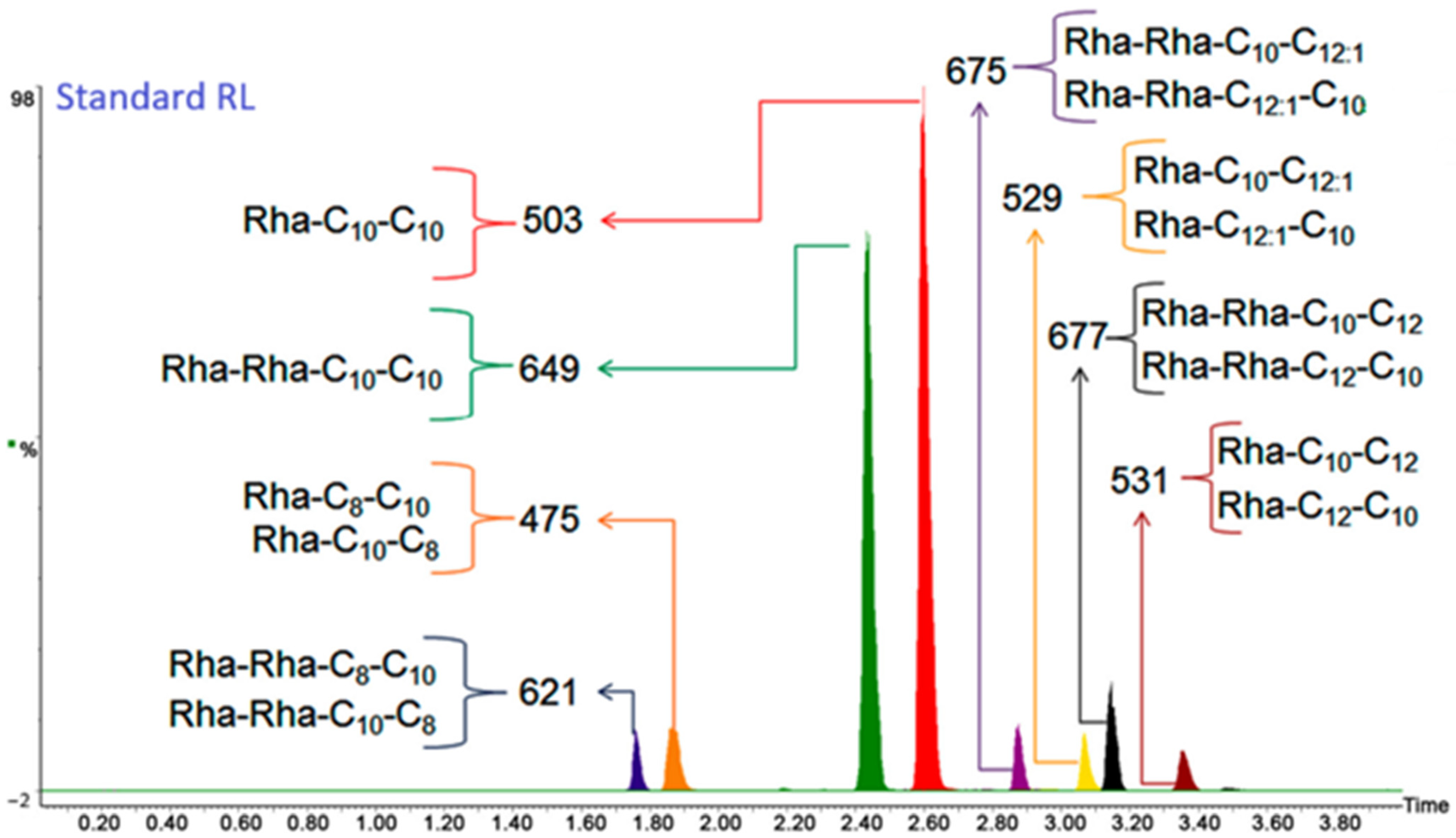 - Calleja, G.M. Identification of Rhamnolipids Produced by Pseudomonas aeruginosa 6k-11 Contained in Halos Revealed on CTAB/MB Agar Using UPLC–MS/MS. Master’s Thesis, National University of San Marcos, Lima, Peru, 2016. Available online: https://cybertesis.unmsm.edu.pe/item/3a388105-2f79-4a60-82d0-07bf62c4f230 (accessed on 21 November 2025).
