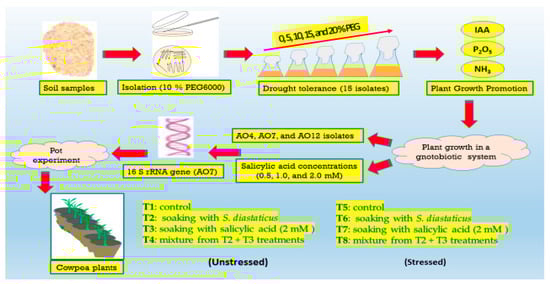 Based on what has been mentioned, there are some workable ways to lessen this detrimental impact on cowpea plant output, such as chemical and biological techniques [12]. By sustaining plant growth and absorption and boosting the rhizospheric soil’s potency, plant growth-promoting rhizobacteria (PGPR) play a critical role in the afforestation and restoration of arid regions [13,14]. PGPR inoculation can help plants deal with drought stress by lengthening roots, which allows roots to reach the deeper layer of soil to obtain moisture, in addition to preserving the level of phytohormones in plants, which either produce or break down plant hormones or positively alter their synthesis and signaling pathways [15,16]. Additionally, these bacteria are capable of producing soluble iron compounds (siderophore), fixing atmospheric nitrogen, synthesizing antibiotics, and solubilizing inorganic phosphates [17]. Additionally, they are capable of producing the phytohormones gibberellins (GA), cytokinins, 1-aminocyclopropane-1-carboxylic acid (ACC), and indole-acetic acid (IAA) [18,19]. Isolated PGPB has been successfully applied to reduce drought stress in plants, according to several research [20,21]. Nevertheless, the majority of these investigations have focused on specific bacterial species, primarily Bacillus and Pseudomonas. Over the years, there has been very little focus on using actinomycetes species to improve plants’ ability to withstand stress. Actinomycetes, which are primarily found in soils, are well known for producing bioactive secondary metabolites and antibiotics as well as for their exceptional capacity to endure in harsh conditions [22,23].