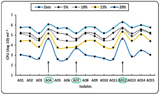 Fifteen bacterial isolates, labeled AO1–AO15, were isolated in soil samples from the western region of El-Minia, which is thought to be one of the most promising for agriculture despite long-term water stress and possible desertification. To assess their tolerance, all isolates were cultivated on nutrient broth and/or nutritional agar medium that had been supplemented with higher doses of PEG6000 (0, 5, 10, 15, and 20%). While all isolates showed some tolerance to PEG, only three isolates (AO4, AO7, and AO12) showed the maximum tolerance, with counts of 4.63, 3.67, and 4.63 CFU (log10 mL−1) at the highest concentrations of PEG (20%) using the plate count technique after 72 h, respectively (Figure 2).