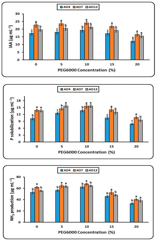Plant growth traits (IAA, P solublilization, NH3 production) of different isolates (AO4, AO7 and AO12) to tolerance different levels of PEG6000 (0, 5, 10, 15 and 20%) on NB medium. Using DMRT (5%), the means that are followed by a common letter do not differ substantially. Values are mean following the SD of three replicates.