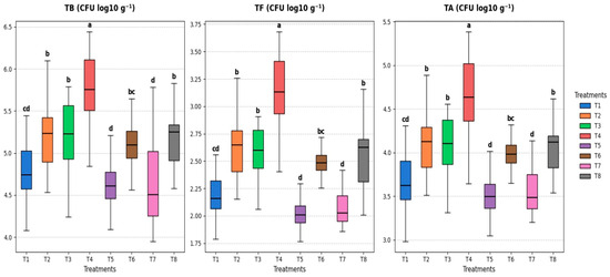 The microbial community, which comprises the total number of bacteria, actinomycetes, and fungi in the rhizosphere of cowpea plants grown under various soaking treatments with S. diastaticus and SA in both stressed and unstressed conditions, was found to differ significantly (p ≤ 0.05) after 60 days of sowing (Figure 5). When compared to the other treatments, the T4 treatment (combination + unstressed) showed the highest population of total counts of bacteria (5.74 CFU log10 g−1), actinomycetes (4.62 CFU log10 g−1), and fungi (3.12 CFU log10 g−1). In contrast, the T8 treatment (combination + stressed) recorded 5.16 CFU log10 g−1 for total counts of bacteria, 4.04 CFU log10 g−1 for actinomycetes, and 2.54 CFU log10 g−1 for fungi (Figure 5).