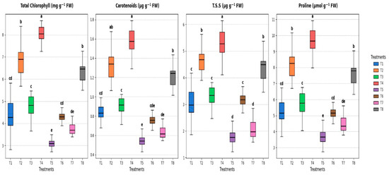 The levels of total chlorophyll, carotenoids, total soluble sugar, and proline in cowpea leaves after 60 days of planting varied significantly (p ≤ 0.05) depending on the soaking with S. diastaticus and SA (Figure 6). The highest total chlorophyll values were 6.32 mg g−1 FW for the T8 treatment (soaking with S. diastaticus + soaking with salicylic acid), followed by 4.31 mg g−1 FW for the T6 treatment (soaking with S. diastaticus) over the control treatment (T5), and 3.11 mg g−1 FW under stress. In comparison to T1 treatment (control), which obtained 0.85 and 3.13 µg g−1 FW, respectively, T4 treatment showed the highest values for carotenoids and TSS, 1.57 and 5.25 µg g−1 FW (Figure 6). Furthermore, the proline (µmole g−1 FW) parameter revealed that, in contrast to unstressed treatments, the T8 treatment recorded 7.59, followed by 5.17 for the T6 treatment and 4.54 for the T57 treatment, while the control treatment (T5) recorded 3.73 (Figure 6). Therefore, T8 > T6 > T7 > T5 for different applications under strained conditions and T4 > T2 > T3 > T1 for the other applications under unstressed conditions, according to the previously mentioned data.