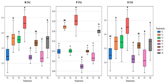 Samples that had been dried for three days at 65 °C were ground into a uniform powder (IKa-Werke, M 20 Darmstadt, Germany). According to Page et al. [48], N (%) was determined using the Micro-Kjeldahl method, whereas P and K% were determined using spectrophotometers and the atomic absorption spectrometry method, respectively [49,50].