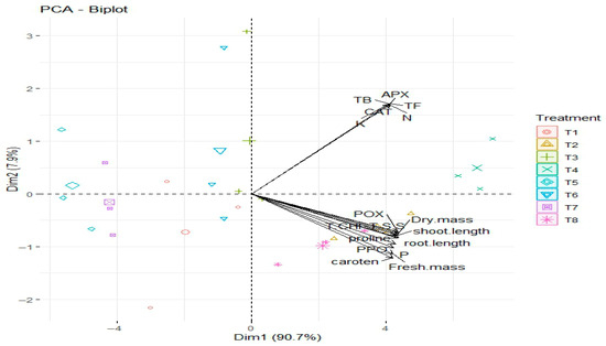 Similar to this, APX, CAT, TF, and N project significantly along Dim 2 and are positively correlated, indicating a connection between these biochemical traits (Figure 9). Additionally, treatments are distributed throughout the four quadrants, each of which reflects a different reaction. Stronger connections with specific qualities are indicated by treatments placed close to their vectors. For example, treatments near the dry mass and shoot length vectors on the right side of the biplot probably showed superior growth performance, whereas treatments near the APX, CAT, and TF vectors may have higher enzymatic or antioxidant activity (Figure 9). All things considered, the PCA effectively divides the treatments according to their development and biochemical characteristics, displaying distinct patterns of correlation between treatments and variables that are assessed.