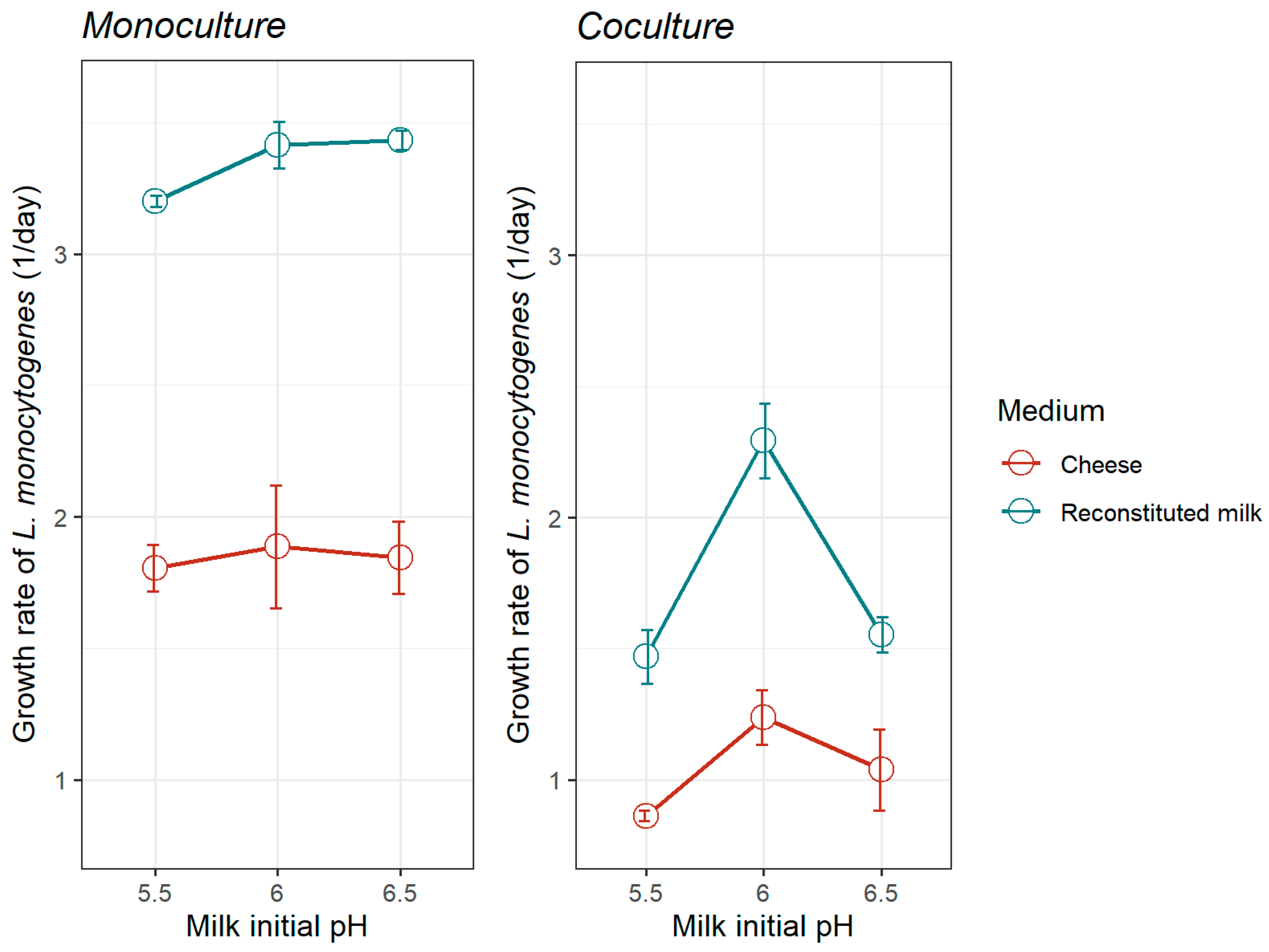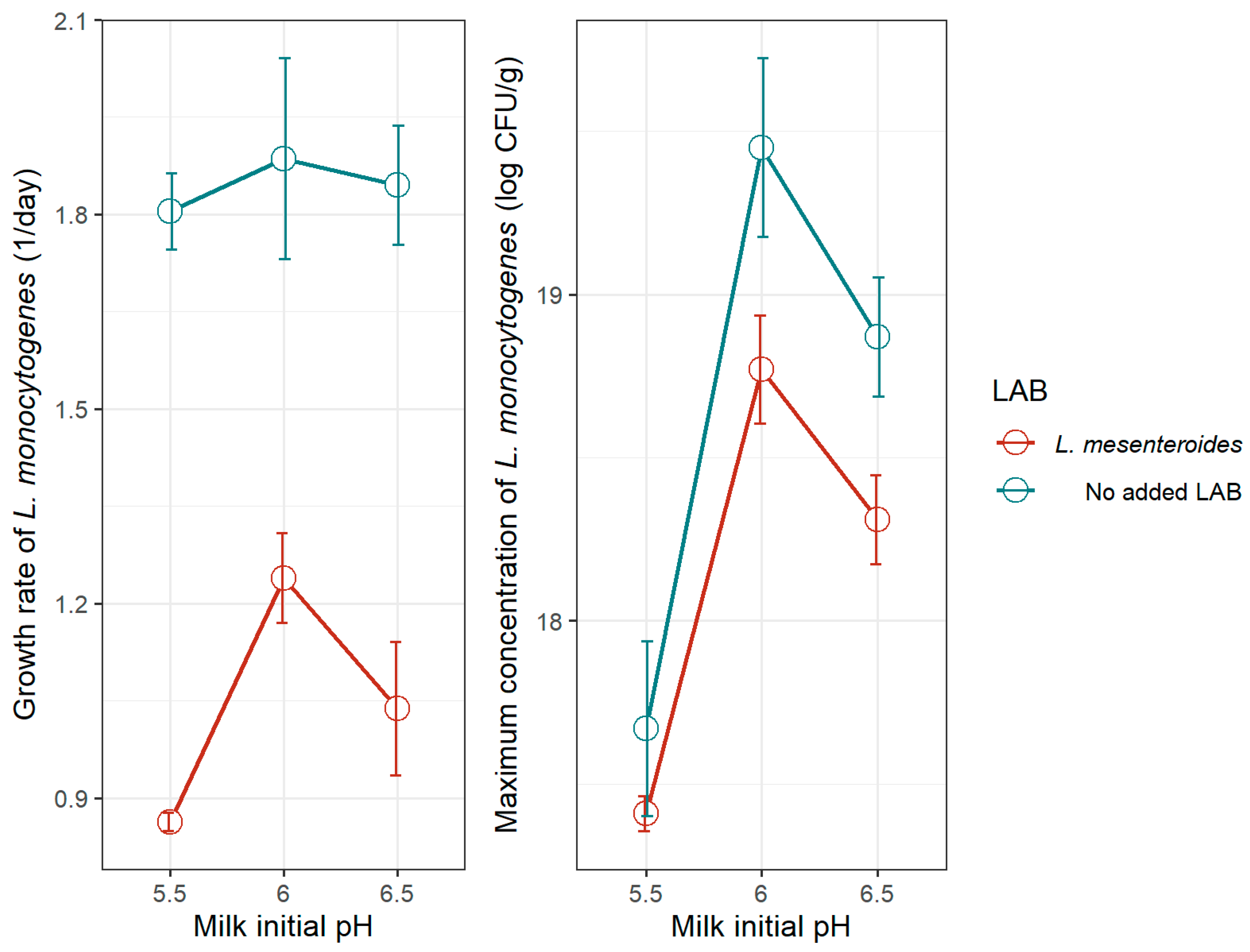 | Initial pH of Milk | L. monocytogenes | L. mesenteroides | |||