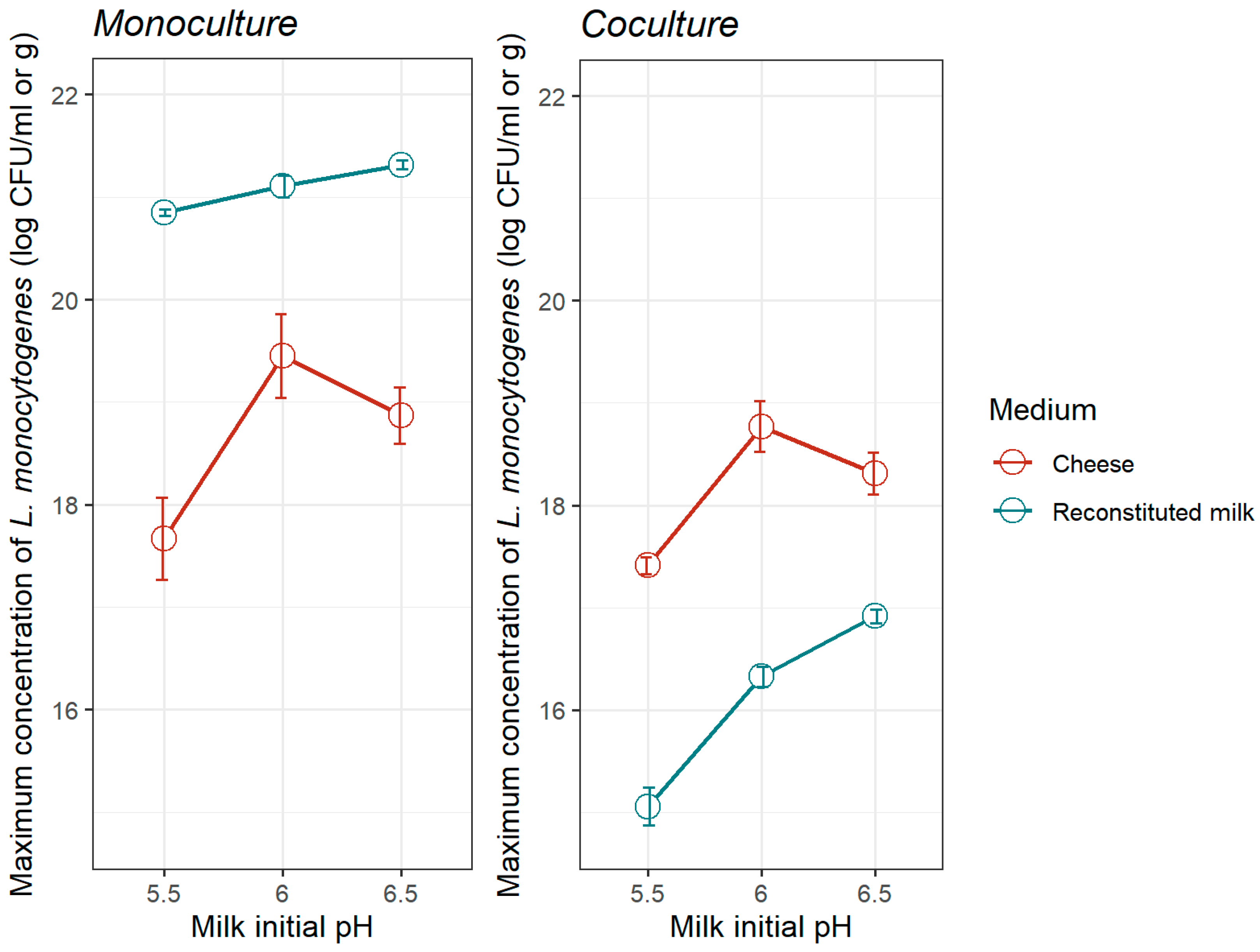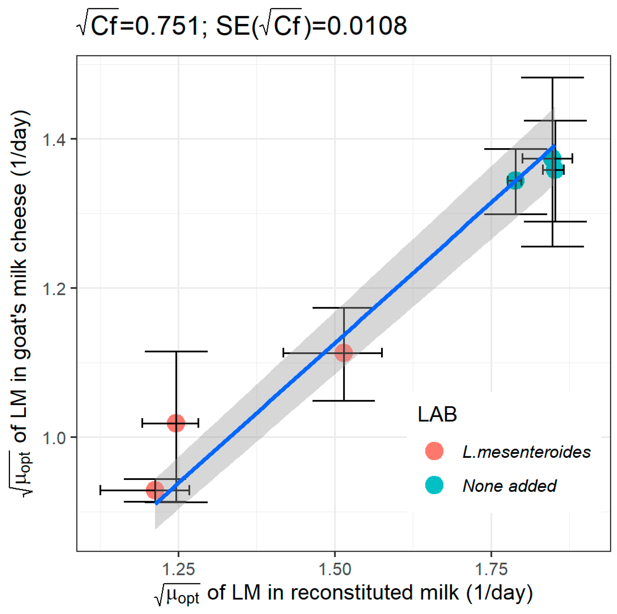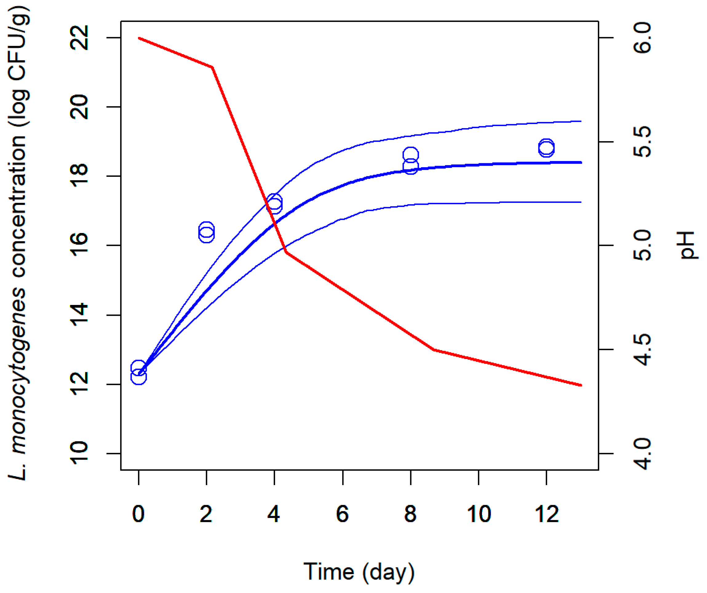2.4.2. Prediction of the Growth of L. monocytogenes in Goat’s Milk Cheese from a Milk Model Medium