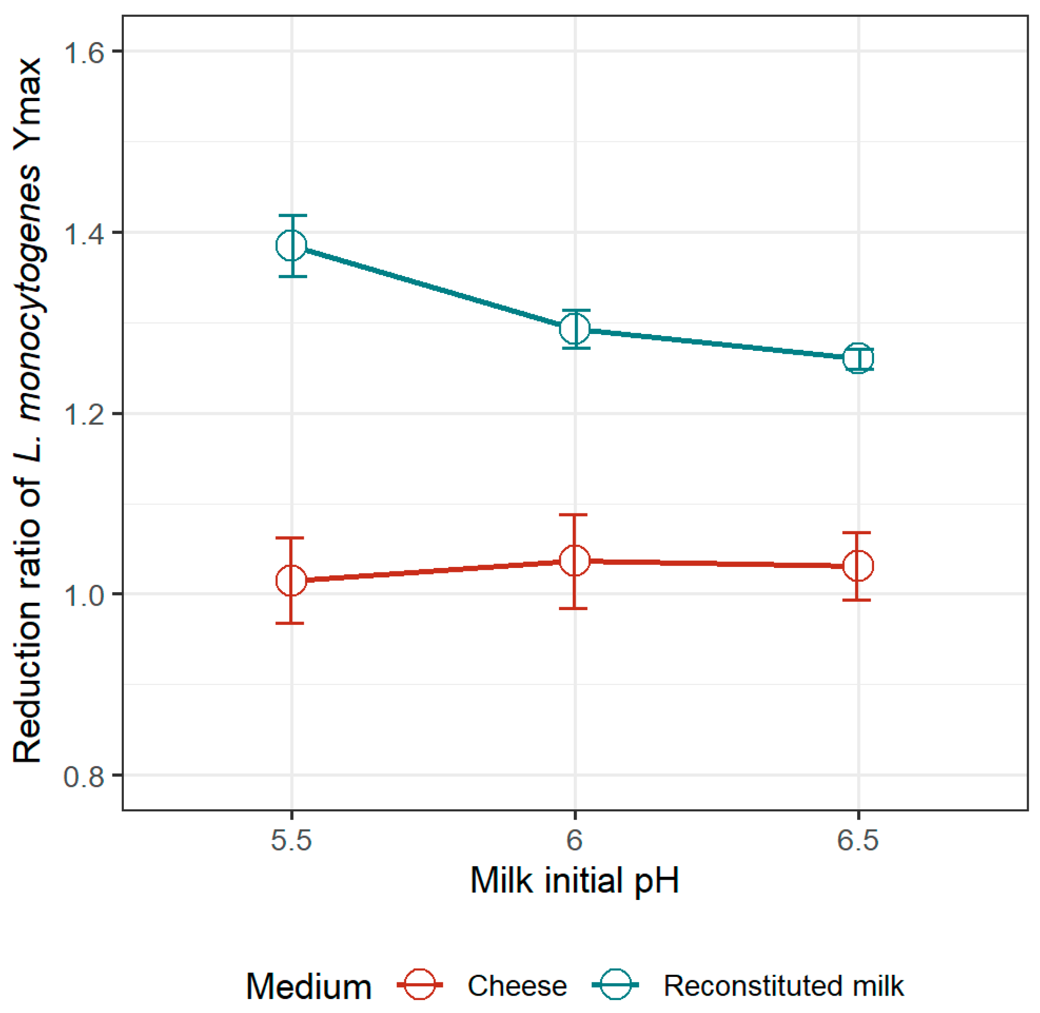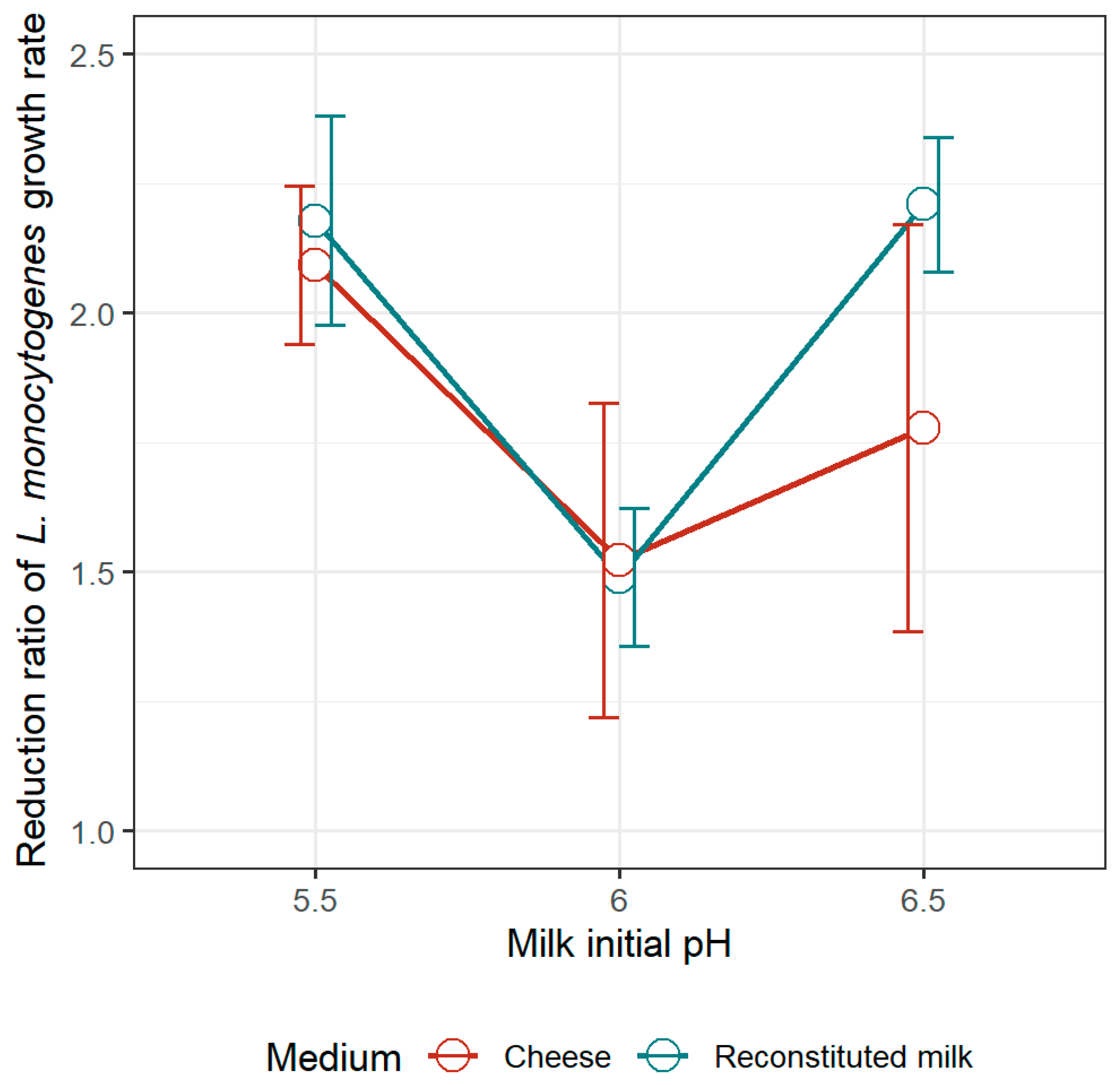 3.2.2. Reduction Ratio of the Optimum Growth Rate of L. monocytogenes Due to the Presence of L. mesenteroides in the Milk Model and in Pasteurized Goat’s Milk Cheese