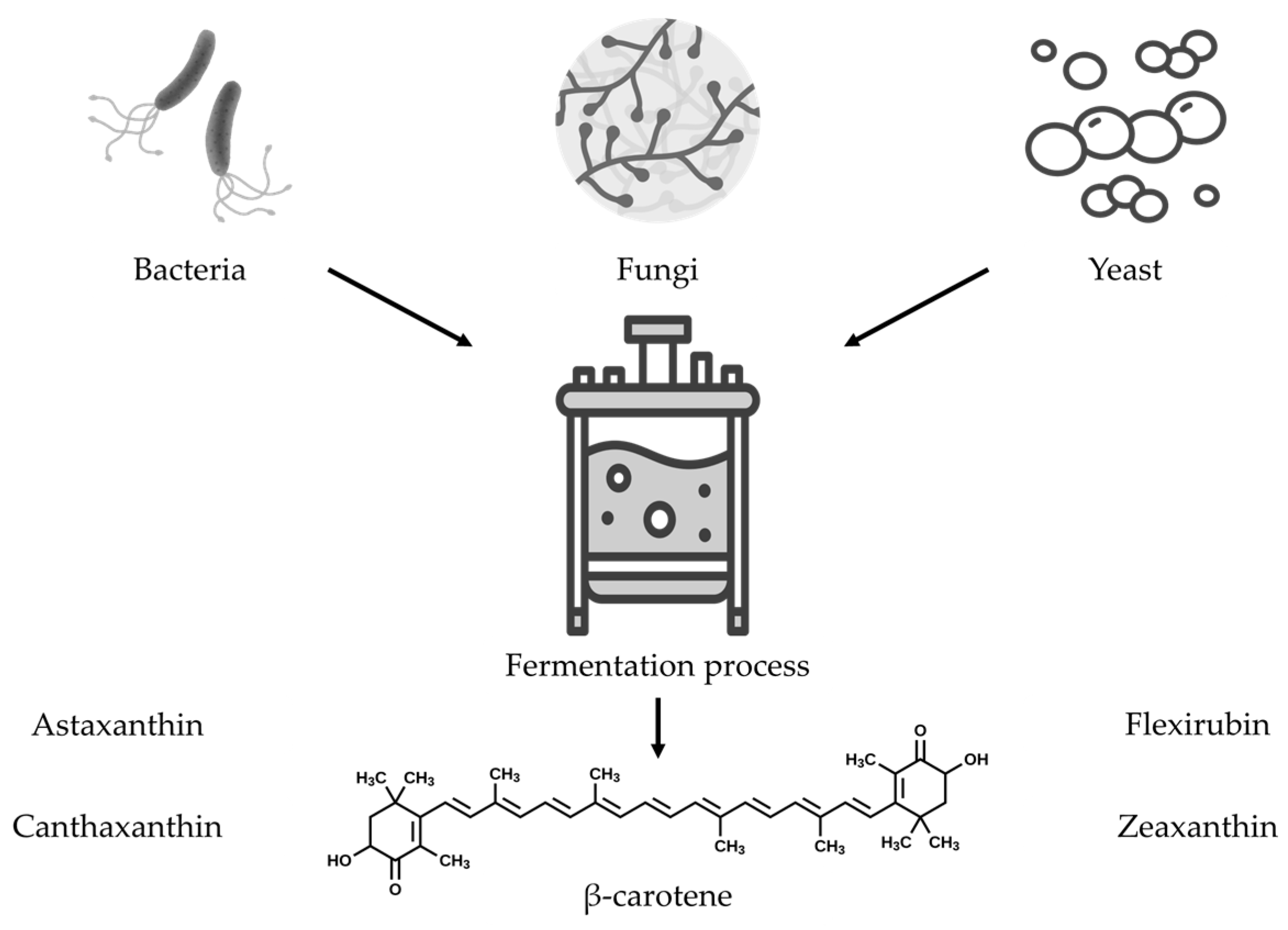 - Wang, J.; Ma, W.; Ma, W.; Fang, Z.; Jiang, Y.; Jiang, W.; Kong, X.; Xin, F.; Zhang, W.; Jiang, M. Strategies for the efficient biosynthesis of β-carotene through microbial fermentation. World J. Microbiol. Biotechnol. 2024, 40, 160. [Google Scholar] [CrossRef] [PubMed]