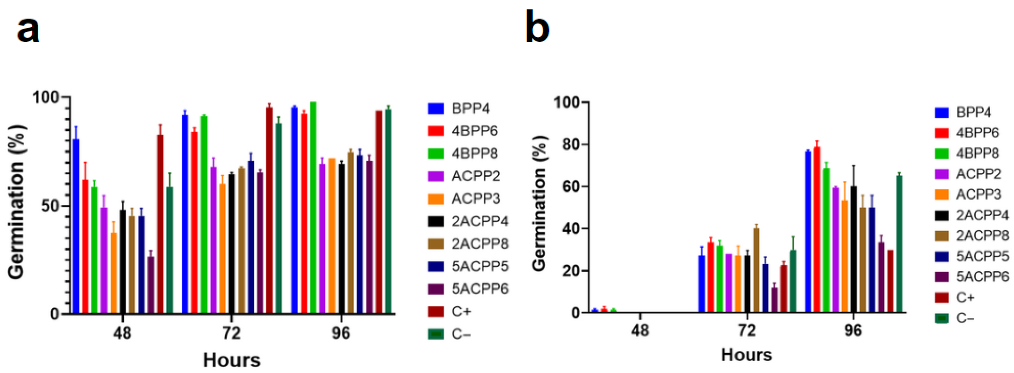 4.3. Plant Growth-Promoting Capacity and Germination Enhancement