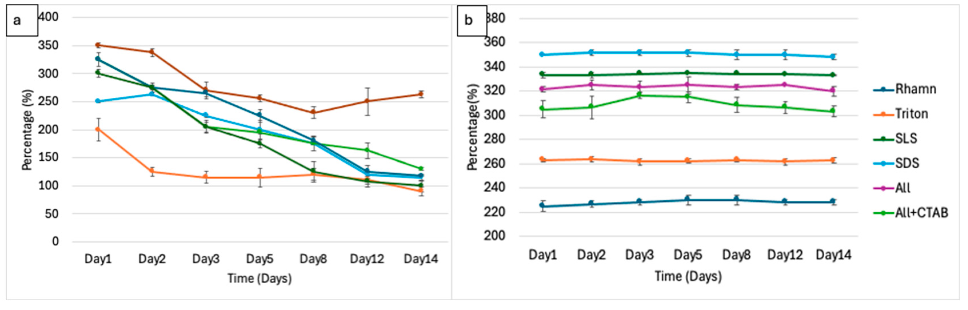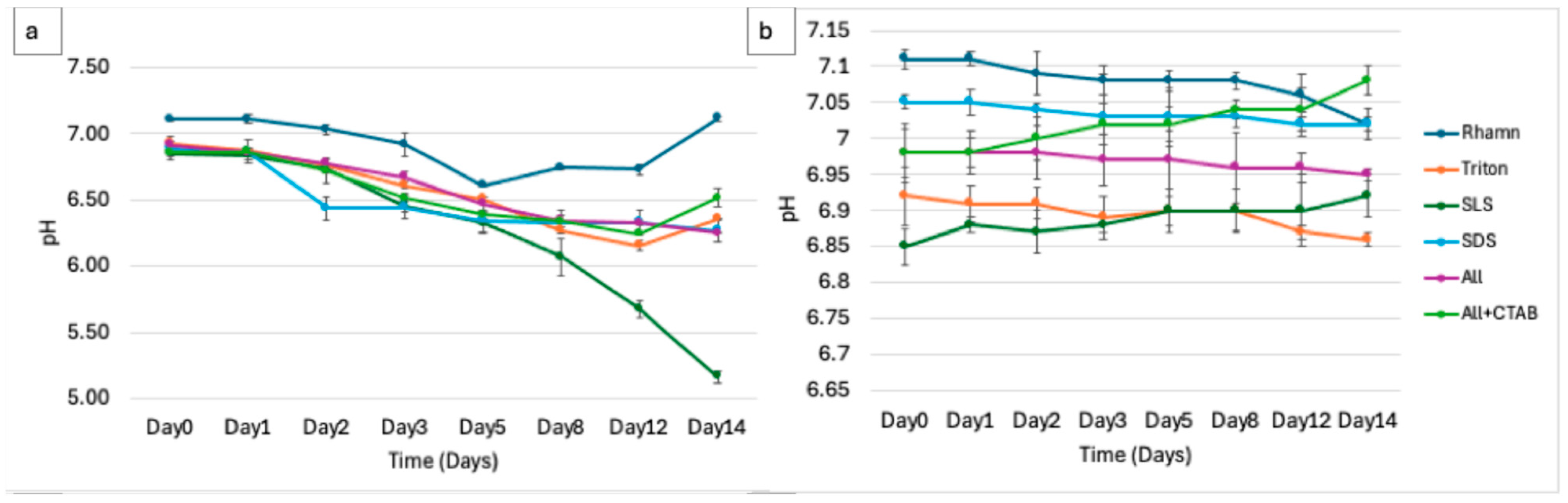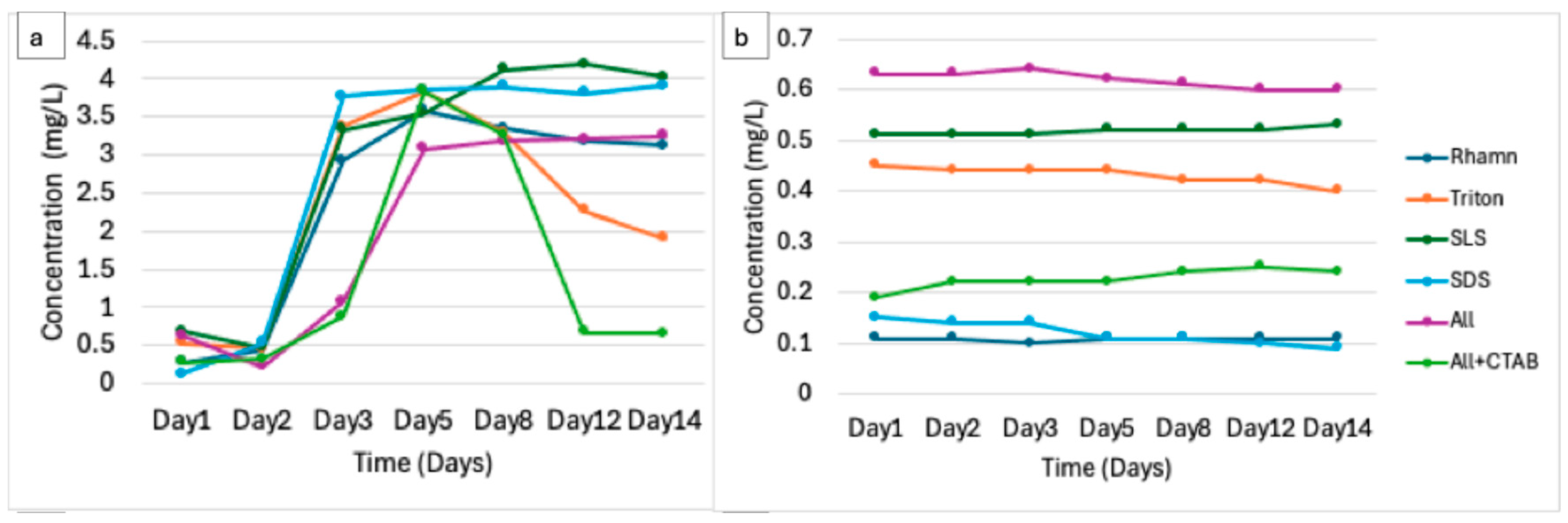 3.5.5. Degradation of Surfactant Mixture (ALL)