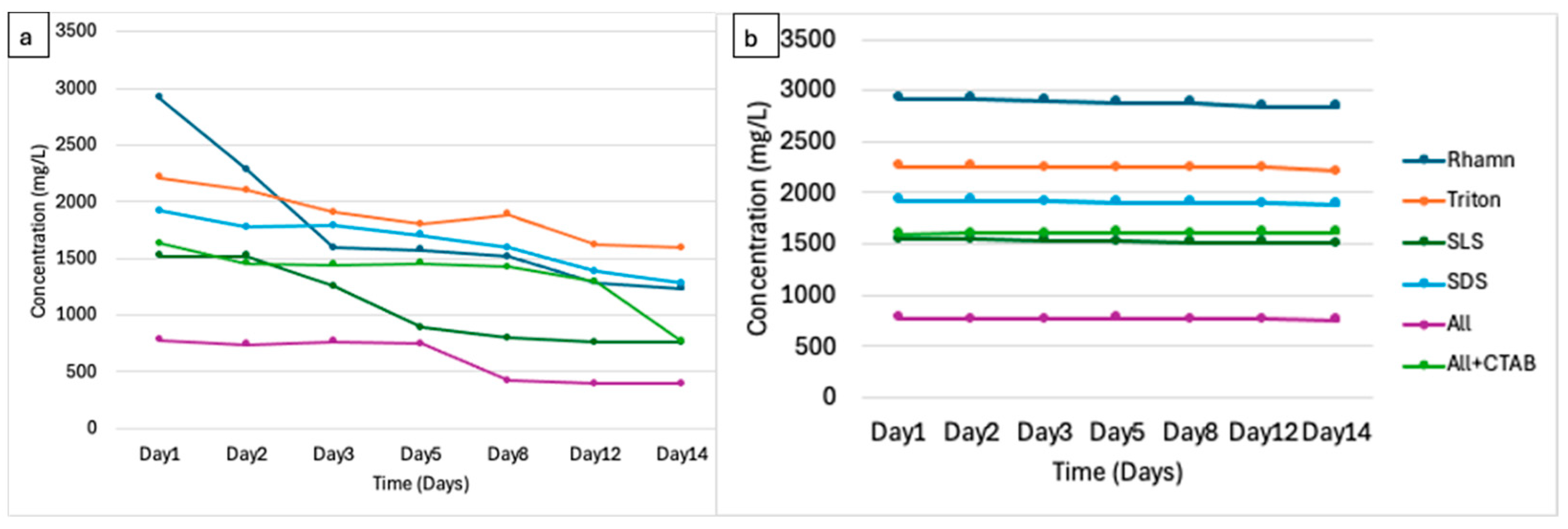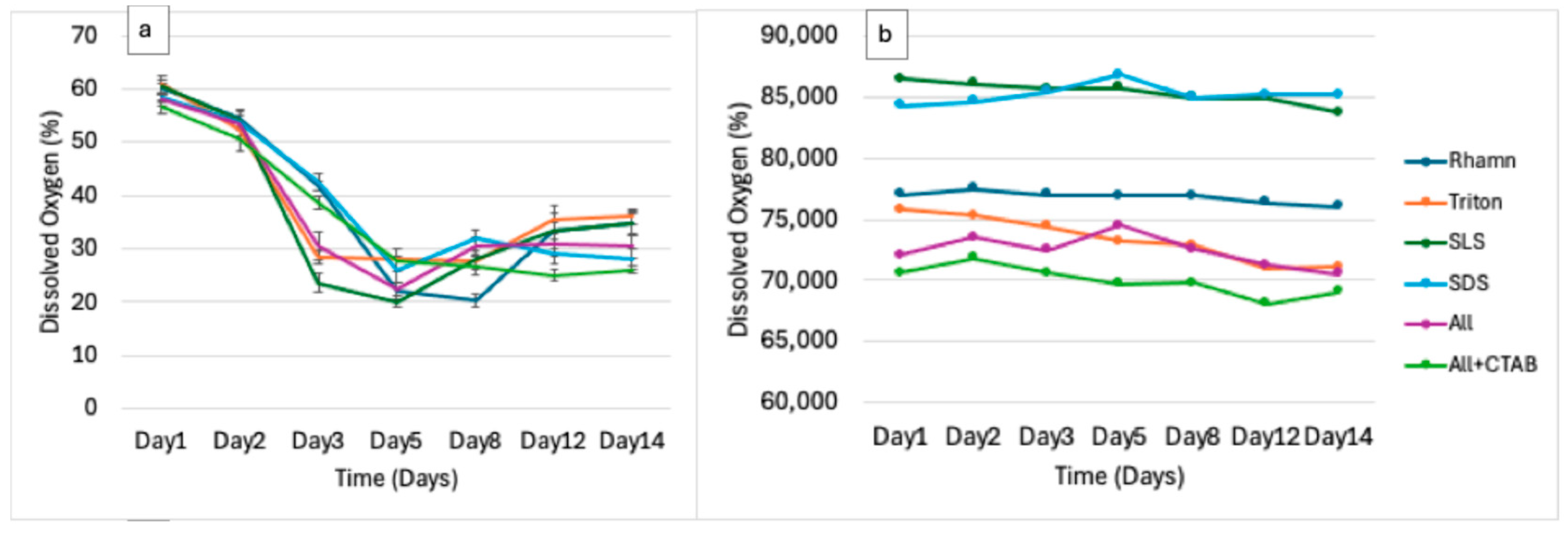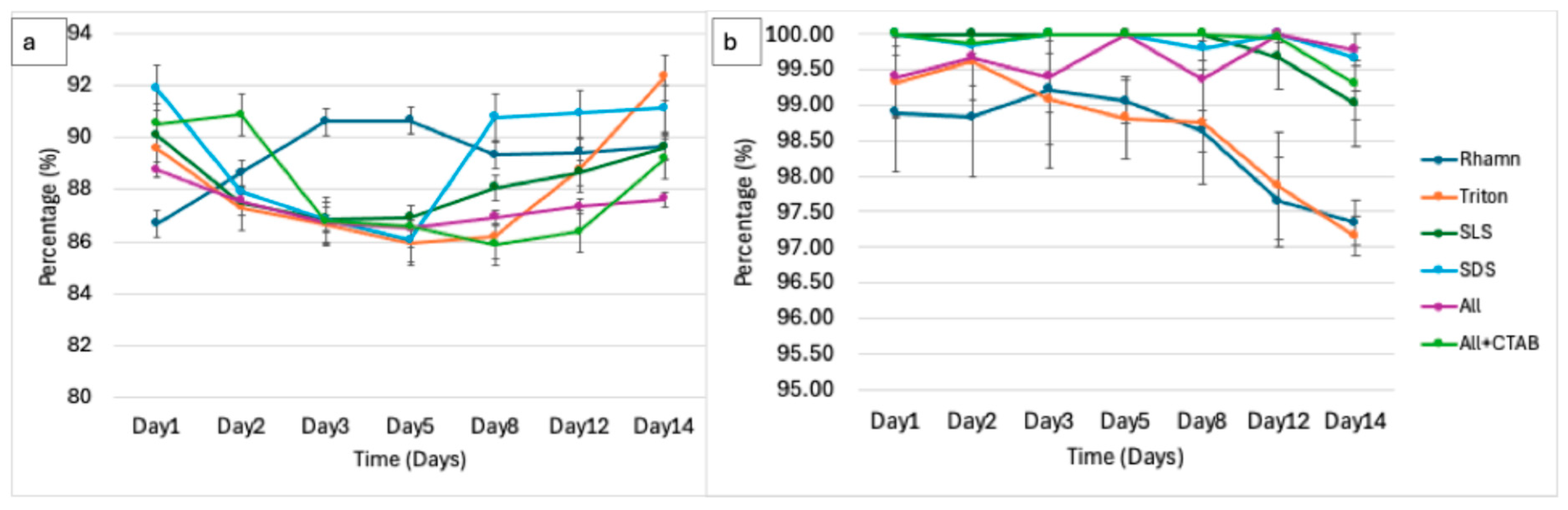 3.5.5. Degradation of Surfactant Mixture (ALL)
