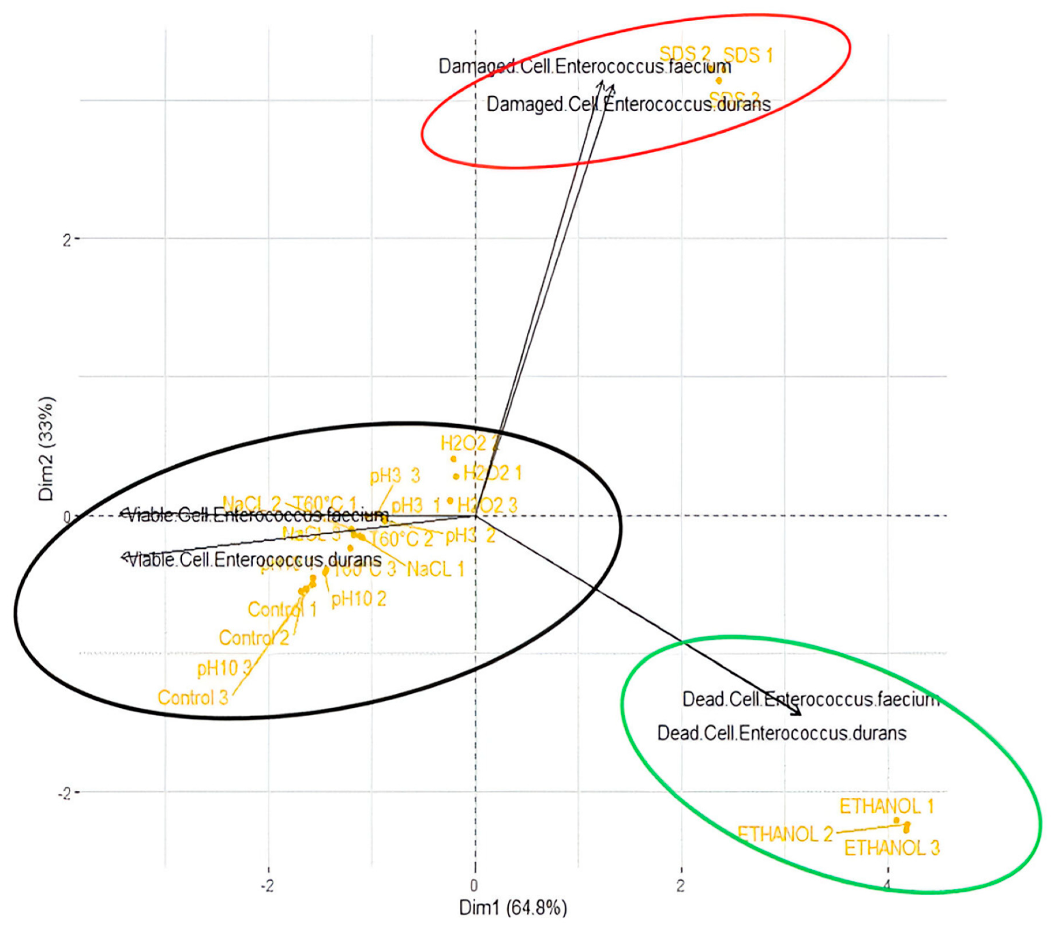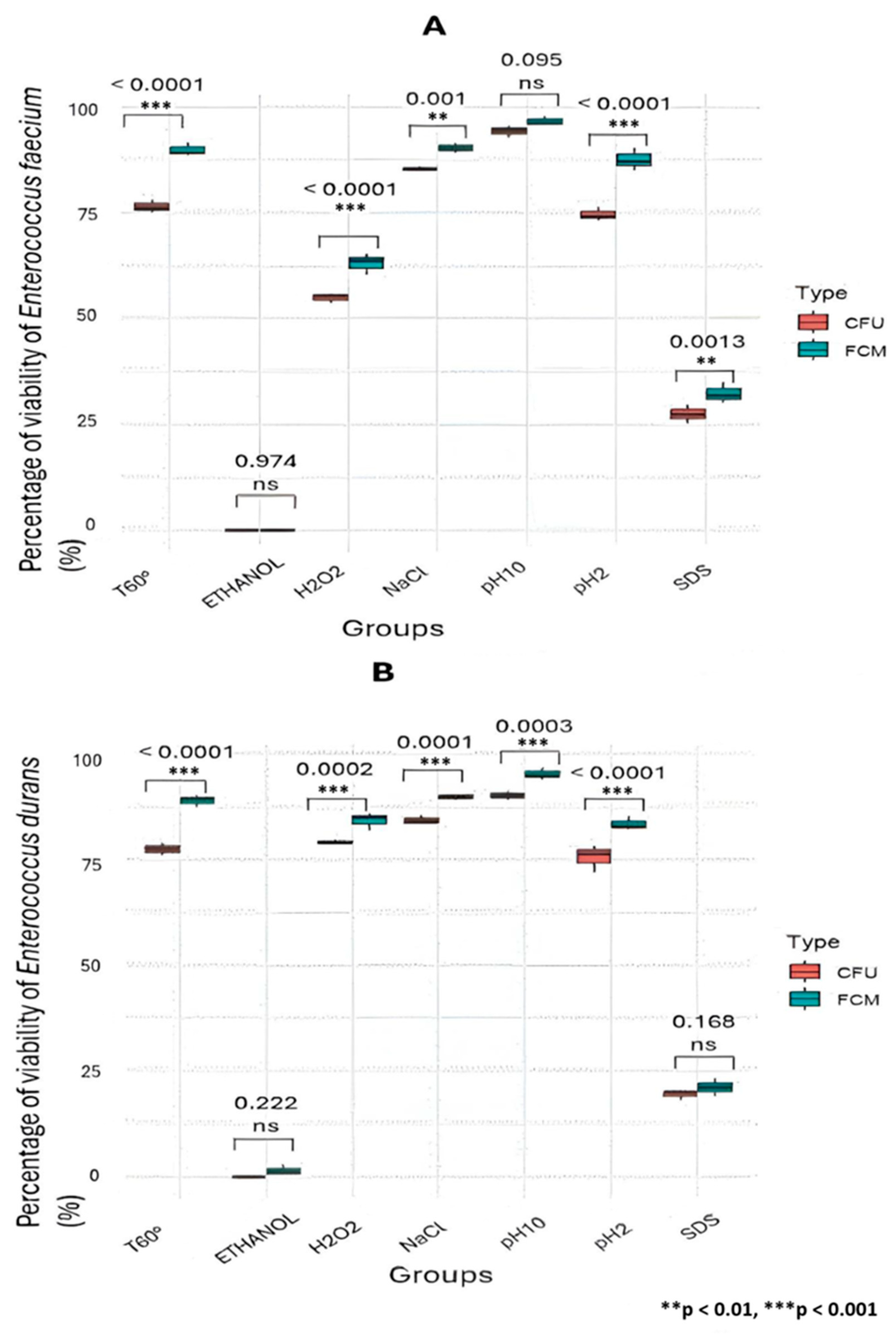 APA StyleAouimeur, H., Boublenza, F., Gerald, G., Barani, A., & Makhlouf, Y. (2026). Assessment of Stress Tolerance of Enterococcus faecium and Enterococcus durans Strains by Flow Cytometry Using NADS Protocol and Traditional Culture Methods. Applied Microbiology, 6(2), 24. https://doi.org/10.3390/applmicrobiol6020024