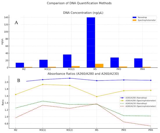 The concentrations measured by the Nanodrop are considerably higher than those obtained by the spectrophotometer (Table 7). This may be due to the fact that the Nanodrop is more sensitive. In all cases, the concentration obtained with the spectrophotometer is lower, with a noticeably wide difference in samples with high concentrations (e.g., M5). However, the Nanodrop readings (Figure 3) are in the ideal range (1.99–2.11), and most PCR protocols work well with DNA concentrations between 10 and 100 ng/µL [46].