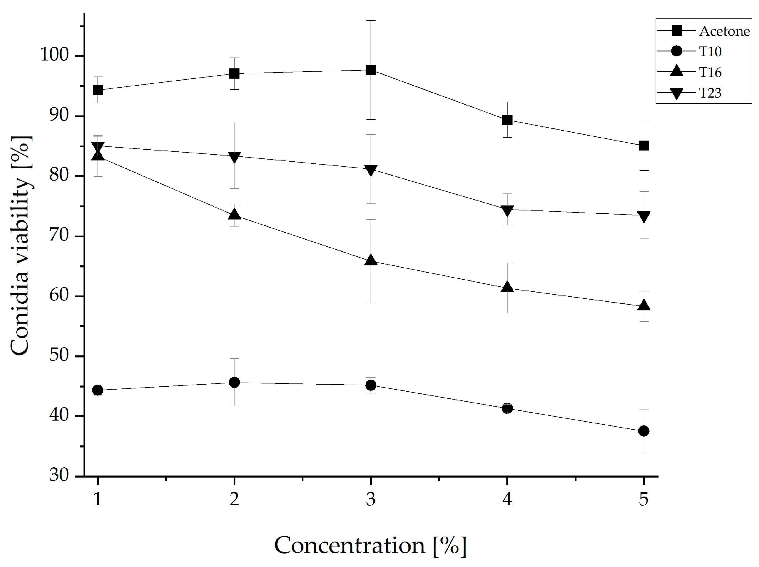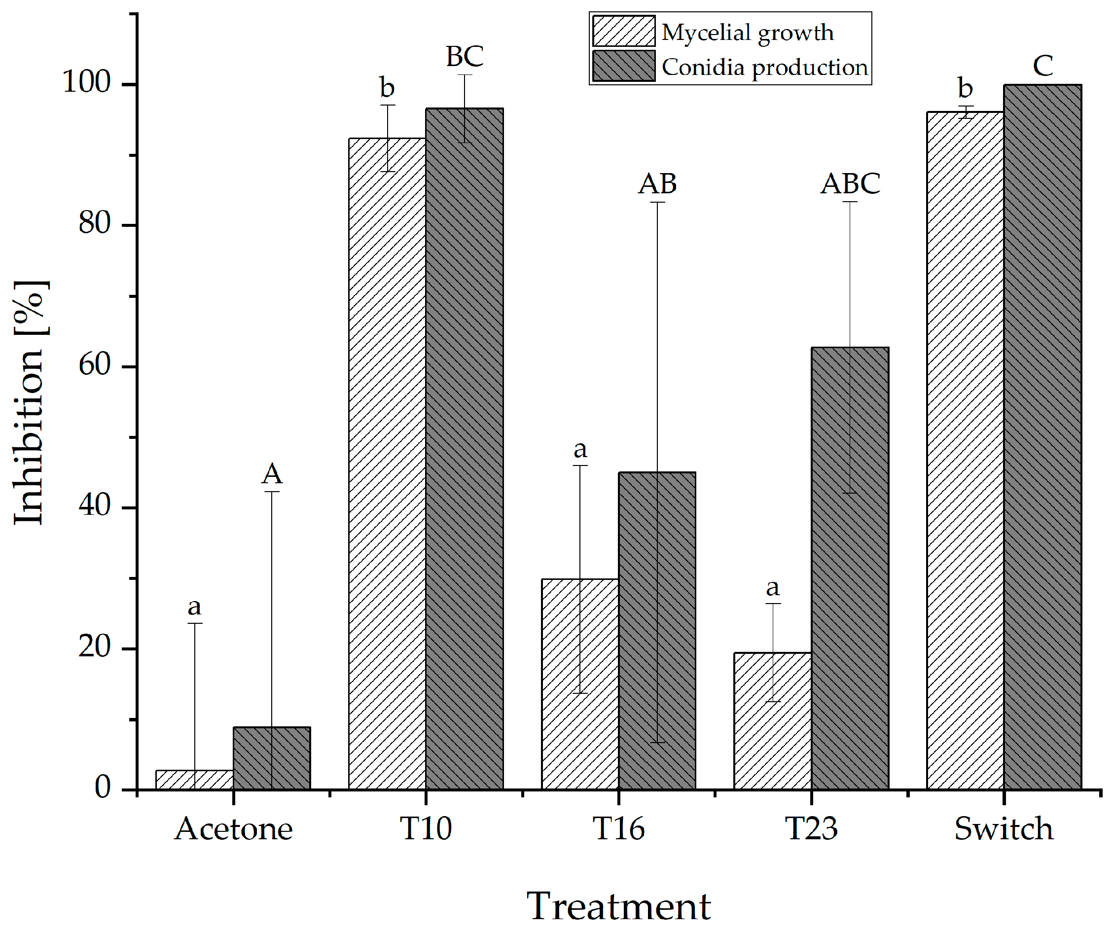 3.3. Inhibition of Conidia Viability of N. rosae by Trichoderma Crude Extracts