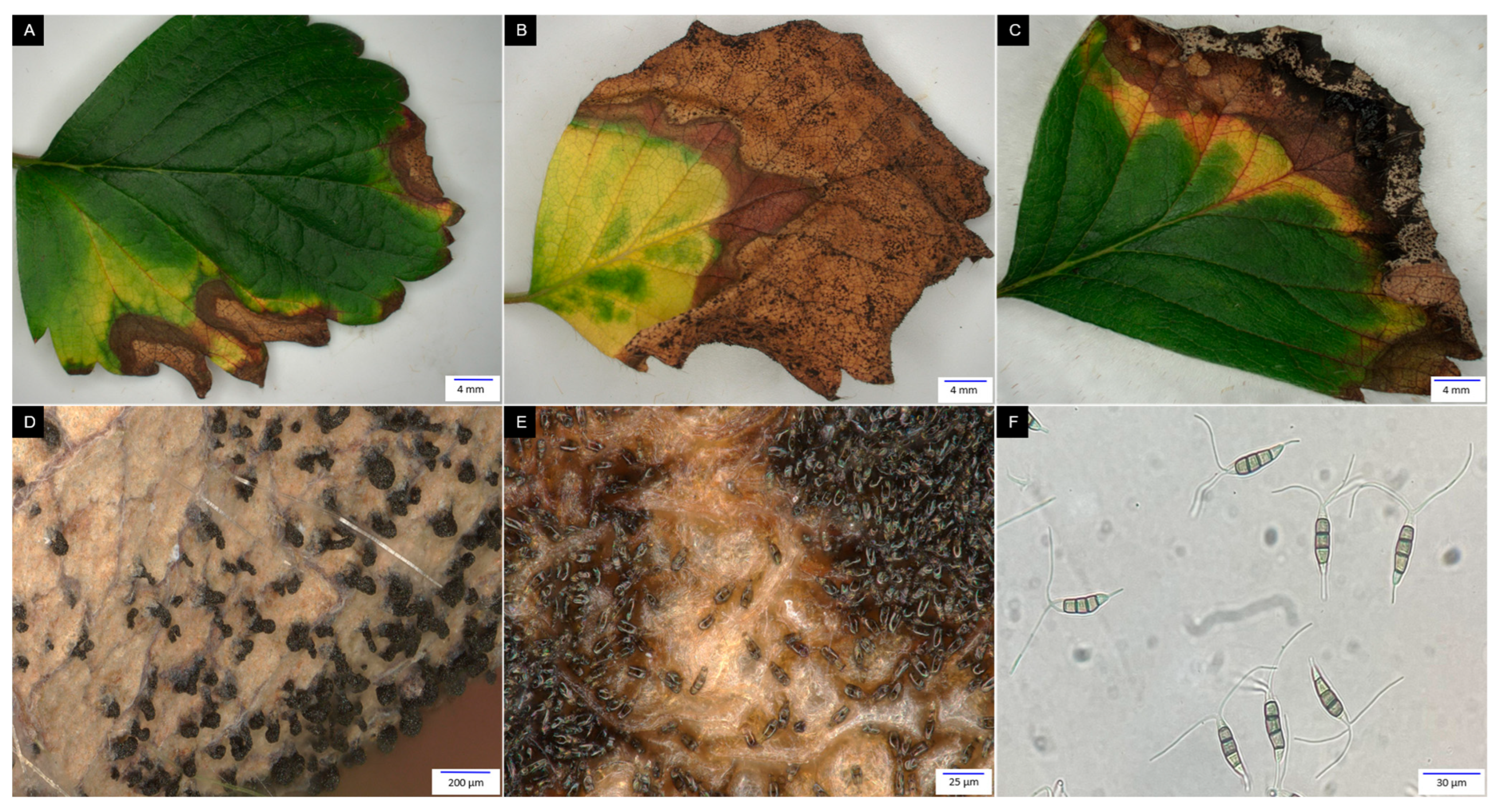 - Rotondo, F.; Klass, T.L.; Scott, K.; McCartney, M.; Jacobs, J.M.; Lewis Ivey, M.L. First Report of Neopestalotiopsis Disease in Ohio Caused by an Emerging and Novel Species of Neopestalotiopsis on Strawberry. Plant Dis. 2023, 107, 940. [Google Scholar] [CrossRef]