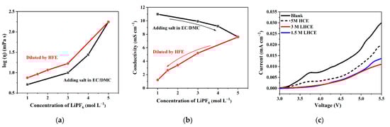 (a) Viscosity of LiPF6/EC/DMC electrolytes (blank line) and LiPF6/EC/DMC/TTE electrolytes; (b) Conductivity of LiPF6/EC/DMC electrolytes (blank line) and LiPF6/EC/DMC/TTE electrolytes; (c) LSV curves of the blank electrolyte, 5 M HCE, 3 M LHCE and 1.5 M LHCE.