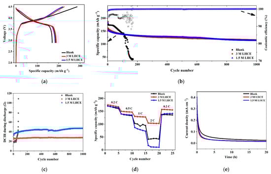 (a) Initial charge and discharge curves of the LCO//graphite cells with the blank, 3 M LHCE and 1.5 M LHCE electrolytes; (b) Cycling performance of the LCO//graphite cells using the blank, 3 M LHCE and 1.5 M LHCE electrolytes at 0.5 C and 30 °C in the voltage range of 2.9–4.5 V; (c) DCIR results of the LCO//graphite cells with the blank, 3 M LHCE and 1.5 M LHCE electrolytes upon cycling; (d) Rate capabilities of the LCO//graphite cells with the blank, 3 M LHCE and 1.5 M LHCE electrolytes at 30 °C; (e) Chronoamperometry plots of the LCO//graphite cells with the blank, 3 M LHCE and 1.5 M LHCE electrolytes at a charged state of 4.5 V.