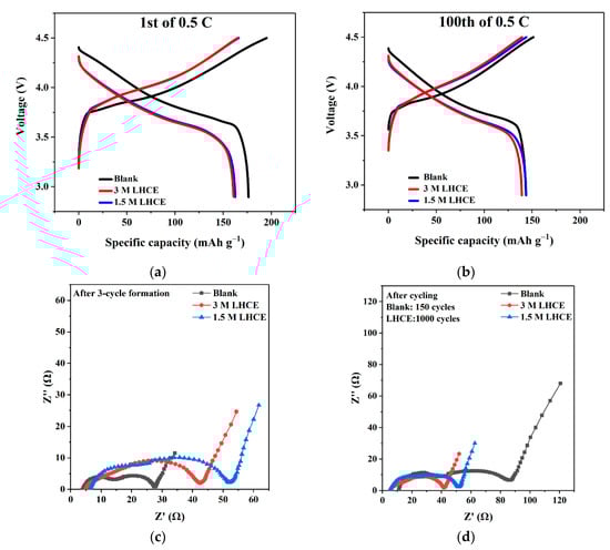 The initial and 100th charge and discharge curves of the cells using different electrolytes at 0.5 C in the voltage range of 2.9–4.5 V are drawn in Figure 3a,b, respectively. The cell with the blank electrolyte exhibits less polarization compared to the cells using the LHCEs in 100 cycles, due to its higher conductivity. Nevertheless, the difference of the polarization between the cells using the blank and LHCEs electrolytes becomes small after 100 cycles, and the cell with the blank electrolyte shows obvious increase of the polarization after 100 cycles. The results are also reflected from the cycling performance (Figure 2b) and the DCIR results (Figure 2c), in which the cell with the blank electrolyte exhibits stable cycling during initial cycles, and the rapid capacity fade occurs after several cycles. It is speculated that the onset of the capacity fade depends on the degree of the electrolyte decomposition. Moreover, the EIS results as shown in Figure 3c,d prove that although the cell with the blank electrolyte has the smallest impedance after the formation, it displays the largest impedance after 150 cycles, corresponding to the zone after the onset of the capacity fade. Note that the semicircles reflect interfacial resistance, the intercept of x axis is ohmic resistance, and the slope line behind corresponds to the diffusion resistance of Li+ ions [45]. After the formation, the cells using the LHCEs shower higher impedance than the cell using the blank electrolyte. While after cycling, the cells with the LHCEs display small interfacial impedance and negligible impedance change after 150 cycles, which indicates the LHCEs form thin and stable interfacial layers at 4.5 V for long cycling. In addition, the cell with the 3 M LHCE has smaller interfacial impedance than the cell with the 1.5 M LHCE, which proves again that the 3 M LHCE is the most outstanding formula.