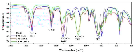 FTIR spectra of blank electrolyte, 5 M HCE, 3 M LHCE and 1.5 M LHCE.