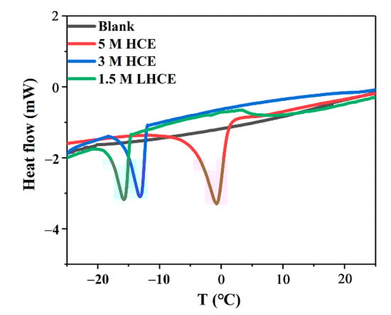 Owing to the high viscosity and melting point of HCE, the changes of thermal properties are also significant in the design of LHCEs. DSC was performed to investigate the freezing point of electrolytes, and the results are shown in Figure 6. As can be seen, the blank electrolyte has no peak from 25 °C to −25 °C for its low concentration, while a peak at 0 °C is observed for the 5 M HCE, corresponding to its freezing or precipitation point. In comparison, the peaks of the 3 M and 1.5 M LHCEs are −13 °C and −16 °C, respectively, which indicates the better low-temperature performance of LHCEs compared to the 5 M LHCE. Nevertheless, the low-temperature performance of LHCEs needs to be enhanced in the practical application.