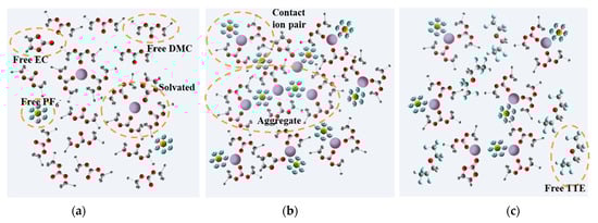 Figure 7 displays the structure illustrations of the solvent shells for the blank, 5 M HCE and 3 M LHCE electrolytes. In the blank electrolyte (Figure 7a), Li+ ions are fully coordinated, along with free negative ions and extra solvents. This structure allows low viscosity, but the abundant electrons of solvent are neutralized with Li ions, which leads to low oxidation voltage [22]. When the salt concentration increases to 5 M (Figure 7b), most Li+ ions have just one or two solvent molecules around, and the negative ions become pairs or aggregate with solvent shells. Though this structure improves stability, the absent of free solvents results in extremely high viscosity [30,46]. After TTE is added, it will not join into previous solvent’s shell for its poor compatibility. Instead, it becomes a lubricant between shells and finally decreases viscosity to an acceptable range [34].