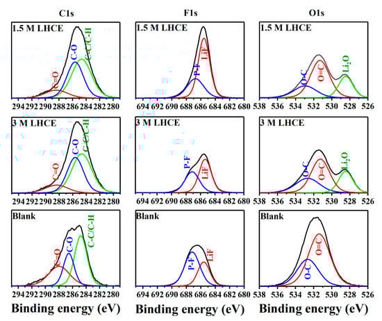 Figure 9 shows the C 1s, F 1s and O 1s XPS spectra of the LCO cathodes after cycling with different electrolytes. In the corresponding C1s spectra, the peaks of 290.2 eV and 288.2 eV represent F-C-F in PVDF and C=O band in the carbonates and organic layer, respectively [47,48]. The peak at 290.2 eV shifts to 289.0 eV with LHCEs, owing to H-C-F products from TTE. Instead, since less solvent generates fewer organic products with LHCEs [49,50], the C=O peak moves to similar position with H-C-F bond. The peak at 286.5 eV belongs to the C-O group of lithium alkyl carbonates [49,50,51]. The F1s spectra indicate more LiF could be formed on the surface due to some side reactions of TTE [22]. The moderate amount of LiF in the 3 M LHCE is believed to be beneficial for the improvement of the electrochemical performance [52], while excess LiF in the 1.5 M LHCE is not necessary. In O1s spectra, the peaks at 531.2 eV and 532.6 eV correspond to C=O and C-O of lithium alkyl carbonate, respectively, and the ratio of the two peaks slightly changes between the blank electrolyte and LHCEs, which is probably from the different participations of EC and DMC in the solvation when the concentration changes. Another small peak at 529.4 eV represents oxygen in LiCoO2. With LHCEs, the intensity of this peak drops down to less than 15% of the cathode using the blank electrolyte, indicating the formation of loose and incompact CEI layer using the blank electrolyte. Note that the absolute peak intensity here cannot be an indicator of concentration due to the free path of electrons in most CEI components is only about several nanometers, so that higher peaks of LiRCO3 and Li2CO3 with the LHCEs are possible. The C-O bond with the blank electrolyte may correspond to PEG, which is always on the outer layer of CEI [53]. Therefore, the massive PEG from the decomposition of electrolyte would impair the signals of inorganic components [54].