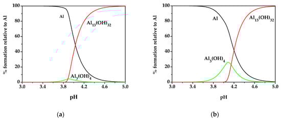 Speciation diagrams of hydrolytic species of Al3+ are shown at I = 0.01, 0.7 mol L−1 in NaCl at T = 298.15 K in Figure 1a,b. These ionic strength values were chosen since they correspond to an ionic strength representative of freshwaters and to the average ionic strength of seawaters, respectively. At I = 0.01 mol L−1 (Figure 1a) and pH ≈ 4, the Al3(OH)45+ species reaches a maximum in the formation percentage of almost 10%; at I = 0.7 mol L−1 (Figure 1b) and pH ≈ 4 it increases to almost 30%. Al13(OH)327+ species predominates in the pH range 4–5, reaching a formation percentage of 50% at pH = 4 at I = 0.01 mol L−1 (Figure 1a) and at pH = 4.25 at I = 0.7 mol L−1 (Figure 1b).