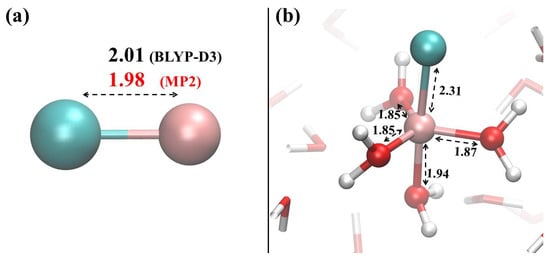 Figure 2. (a) Structure of the AlCl2+ complex optimised at the MP2/6-311++G(2d,2p) quantum-mechanical level under implicit solvation. The interatomic distance is shown in Å both for the calculation carried out at the MP2 level (red) and for that at the BLYP-D3 level (black); (b) structure of the same complex equilibrated upon explicit solvation treatment achieved via ab initio molecular dynamics performed at the BLYP-D3 level. Relevant distances averaged over the last 20 ps of the trajectories are shown in Å.