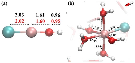 Figure 3. (a) Structure of the AlClOH+ complex optimised at the MP2/6-311++G(2d,2p) quantum-mechanical level under implicit solvation. Interatomic distances are shown in Å both for the calculation carried out at the MP2 level (red) and for that at the BLYP-D3 level (black); (b) structure of the same complex equilibrated upon explicit solvation treatment achieved via ab initio molecular dynamics performed at the BLYP-D3 level. Relevant distances averaged over the last 20 ps of the trajectories are shown in Å.
