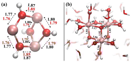 Figure 4. (a) Structure of the polynuclear hydroxo Al3(OH)45+ complex optimised at the MP2/6-311++G(2d,2p) quantum-mechanical level under implicit solvation. Relevant interatomic distances are shown in Å both for the calculation carried out at the MP2 level (red) and for that at the BLYP-D3 level (black); (b) structure of the same complex equilibrated upon explicit solvation treatment achieved via ab initio molecular dynamics performed at the BLYP-D3 level. Some relevant distances averaged over the last 5 ps of the trajectories are shown in Å.