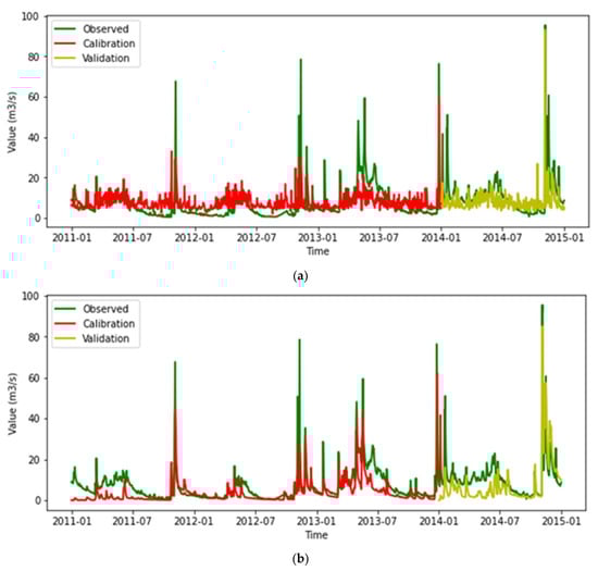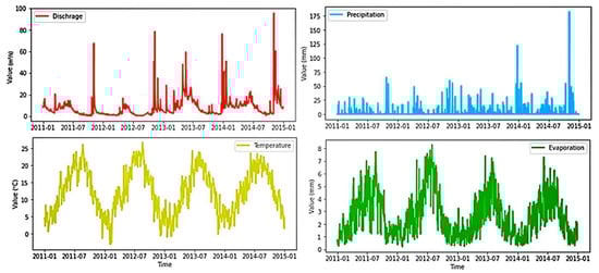 The daily time series data of discharge, precipitation, temperature, and evapotranspiration is preprocessed to fit in the model for the best prediction. We found that discharge of all other three-time series had been collected for 7 years in raw file data, from 2008–2014 and discharge was only from 2011 to 2014. Consequently, all other data are trimmed and data from 2011 to 2014 are used for modeling. The gap and irregularities of the time series are also checked and as a result, all of the data are cleaned except for discharge. In discharge, there was a negative value found in May of 2013 and December 2014, which was most probably caused by gauge error. Therefore, these negative values are filled with the average values of their first three-time steps.