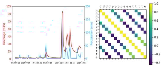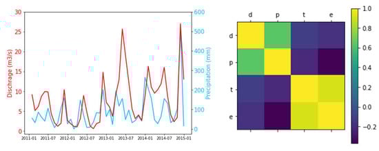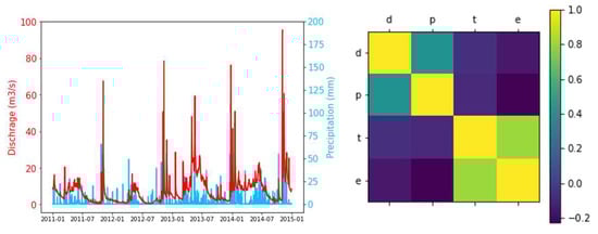 In Figure 3, the left side matrix plot illustrates that the correlation between daily temperature and evapotranspiration is best among all of them, at around 0.8, and after that discharge and precipitation have a good correlation, which is 0.39. The discharge versus precipitation graph shows that discharge is the outline of the precipitation like cumulative water.