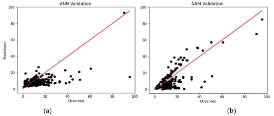 Furthermore, in Figure 9, the NAM model’s training phase performance is better than the testing phase performance, but the ANN model’s testing phase performance is better than the training phase. Based on the stated performance score measures, the NAM model outperforms the ANN model.