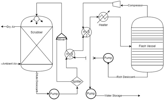 The proposed liquid-desiccant-based AWG system configuration was designed to operate continuously in a closed loop; the desiccant regeneration requires only low-grade thermal energy. The system configuration in Figure 1 consists of four major unit operations: (1) a scrubber column that absorbs water vapor from the ambient air, (2) a liquid–liquid heat exchanger (HE1), (3) a flash vessel that facilitates liquid desiccant regeneration by desorbing water, and (4) a two-phase heat exchanger that acts as a condenser (HE2).