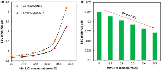 (a) The specific energy consumption (SEC) trend with varied inlet stream concentrations of multiwalled carbon nanotubes (MWCNT)-doped LiCl desiccant from 30 to 35.1 wt.%. (b) Histogram of the SEC values of the atmospheric water generation (AWG) system configuration with 30 wt.% LiCl loaded with MWCNTs at concentrations between 0 and 0.5 vol.%.