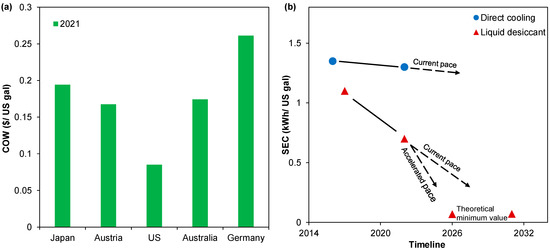(a) The cost of water produced by region using the AWG system configuration with hybrid nanofluids in 2021. (b) The comparison of the SEC values of the AWG system operated by direct air-cooling and liquid desiccant technologies, and highlighting current and projected trends to meet the theoretical minimum value of SEC by 2031, or as early as 2026. The data points were obtained from the model results [32] and, off-the-shelf direct-cooling AWG systems (according to the manufacturers’ specifications).