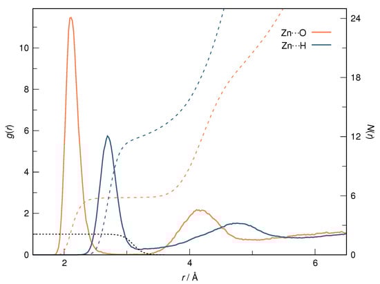 Radial distribution functions, , for Zn⋯O (orange) and Zn⋯H (blue) pairs (solid lines, left ordinate), as well as their running integrals, (dashed lines, right ordinate). The black dotted line represents the smooth cutoff function used for water molecule coordination in Equation (1) (left ordinate).