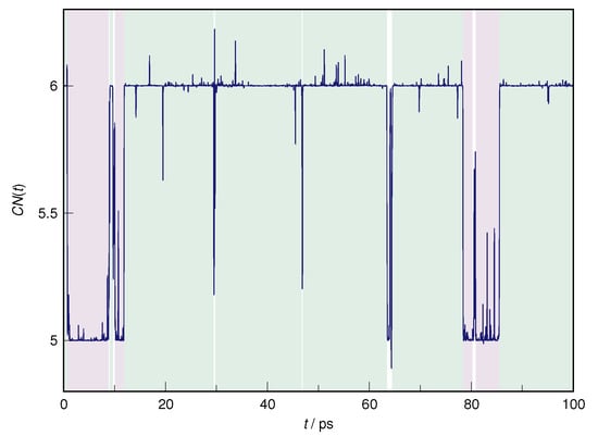 Time evolution of the smooth coordination number of Zn2+, , along the AIMD production trajectory. Light green and light purple areas indicate regions assigned to hexa- and pentacoordinated aqueous Zn(II) complexes, respectively, while white regions indicate transitional periods excluded from detailed analysis.