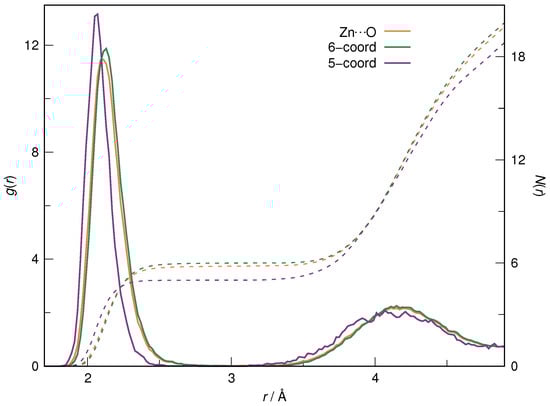 Radial distribution functions, , for Zn⋯O pairs averaged over the entire AIMD trajectory (orange), as well as only over the regions of existence of hexacoordinated (green) and pentacoordinated (purple) aqueous Zn(II) complexes (solid lines, left ordinate), together with their running integrals, (dashed lines, right ordinate).