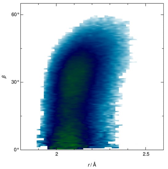 While the positions of O atoms tend to be fixed in the Zn(II) solvation cage, the hydrogen atoms of the first shell water molecules are relatively free to bend from the coplanar arrangement with the Zn–O vector. We define the tilt angle, , as the angle formed between the Zn–O vector and the dipole moment vector of the coordinated H2O molecule. The two-dimensional distribution of water molecule configurations in the plane is shown in Figure 5. The distribution of angles is evidently bimodal, with a global maximum at 0°, indicating a coplanar arrangement of the H2O molecular plane and the Zn–O vector, and a local maximum at ca. 30°, reflecting the presence of a substantial population of water molecules with tilted H atoms. We note here that the latter tend to be located slightly farther away from the central atom.