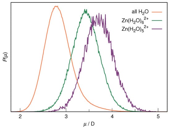 Normalized distribution functions of the molecular dipole moments of water molecules in the studied system, as well as water molecules in Zn(H2O)62+ (green) and Zn(H2O)52+ (purple).
