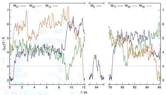 We finally would like to estimate the time frame of a single exchange event based on the trajectories of the participating water molecules. As seen in Figure 2, we register two major exchange events connected to a change in CN of Zn(II), at around 0–12 ps and again at 78–86 ps. Additionally, a short-lived occurrence of Zn(H2O)52+ is found at ca. 64 ps. In order to shed light on the molecular details of these exchange events, we plotted the time evolution of the Zn⋯O distance of involved H2O molecules, as presented in Figure 7.