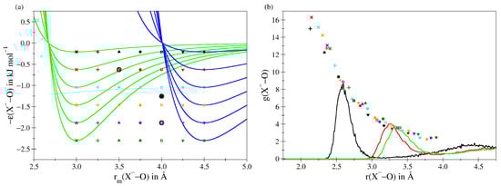 By comparing the location of the resulting first shell peak maximum in the ion-O radial distribution function and the average coordination number with reference data from the literature [,,,,,,,,,,], the best potential parameters for the F, Cl and Br could be identified (see Figure 1b and Table 1).