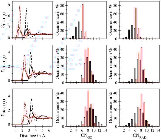 Although the latter strategy can be expected to adjust the solvation parameters within a small margin, already great care has been devoted towards the identification of suitable solute–solvent Lennard–Jones potentials as outlined above. However, the pairwise nature of the classical description provides a more reasonable explanation for the observed deviations. Due to the small size of the F ion, the hydration complex shows the smallest ion–water distances. This implies that contributions arising from the respective Coulomb interactions are highest in this case. Since the classical description does not account for many-body contributions such as polarisation and charge-transfer, it can be expected that, out of the considered systems, F shows the highest susceptibility towards overcoordination. In contrast, the Cl and Br systems display notably increased first shell ion–water distances, thus reducing the magnitude of the Coulombic contributions and, thereby, the risk for observing much higher coordination numbers. Nevertheless, the high intensities in the coordination number distribution and the ion–water RDFs still points towards an overall too strong solute–solvent interaction that cannot be easily compensated by a variation in the Lennard–Jones parameters (see data in Figure 1b). While similar overcoodination effects were also observed in the case of the previously mentioned cations Li, Na and K, the increase in the first shell ion–oxygen peak maxima amounts to at most 50%, with an overall very good agreement in the coordination number distributions when comparing the classical and QM/MM MD simulation results. These difficulties clearly demonstrate that simulations of anionic solutes are much more intricate compared to their cationic counterparts. A reduction of the net-charge of the ions in the simulations to non-integer values could offer a potential solution, which has already been discussed by different authors in the past [,,,].