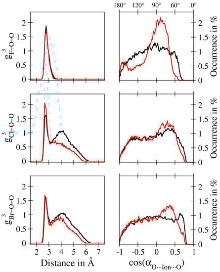 First shell ion–oxygen–oxygen three-body correlation function g (left) and the associated O–ion–O cosine distribution functions (right) obtained for aqueous F (top), Cl (center) and Br (bottom) from the QM/MM (black) and classical (red) MD simulations. The absolute values for the O–ion–O angles follow a non-linear trend and are shown on the secondary x-axis.